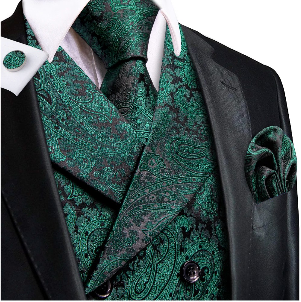 Dark Green Paisley Notched Collar Silk Mens Dress Vest Tie Set- MJ-0741