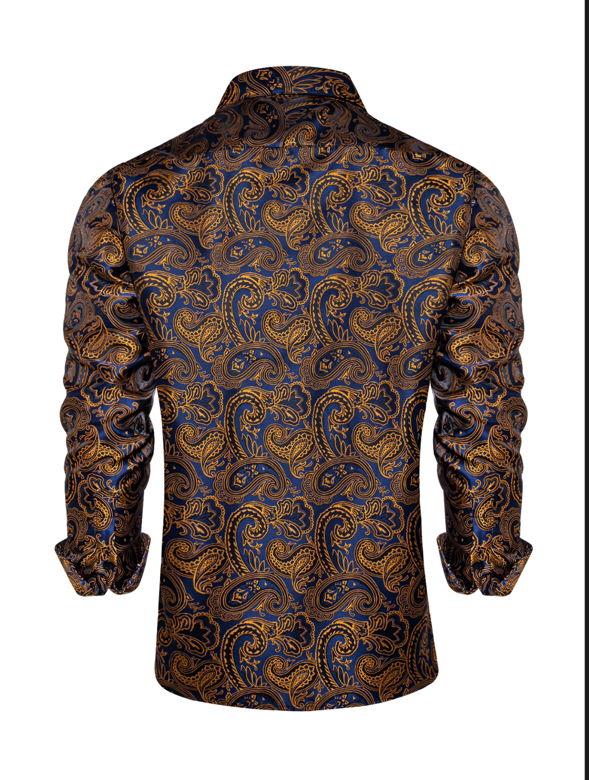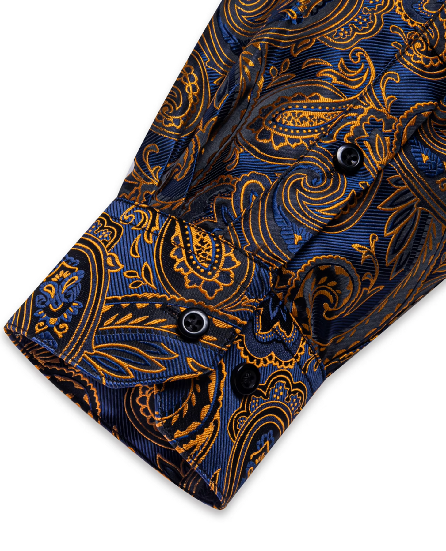 Gold Blue Paisley Silk Button Down Men's Dress Shirt- CYDJ-2619
