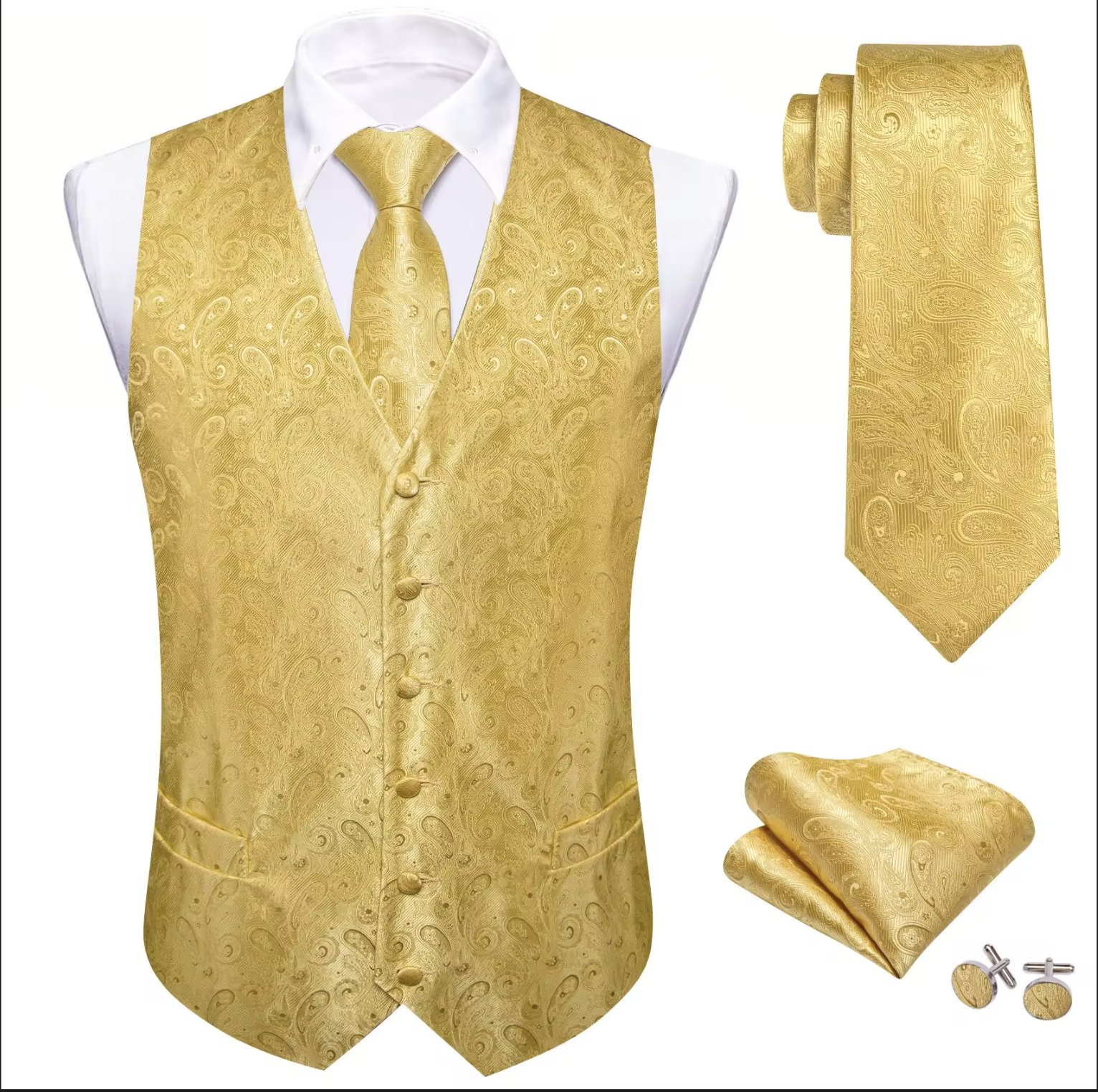 This waistcoat and necktie set features a stunning floral paisley design in gold, adding a touch of sophistication to any outfit. The intricate patterns and rich colors make this set perfect for weddings, formal events, or simply adding a touch of flair to your everyday wardrobe.