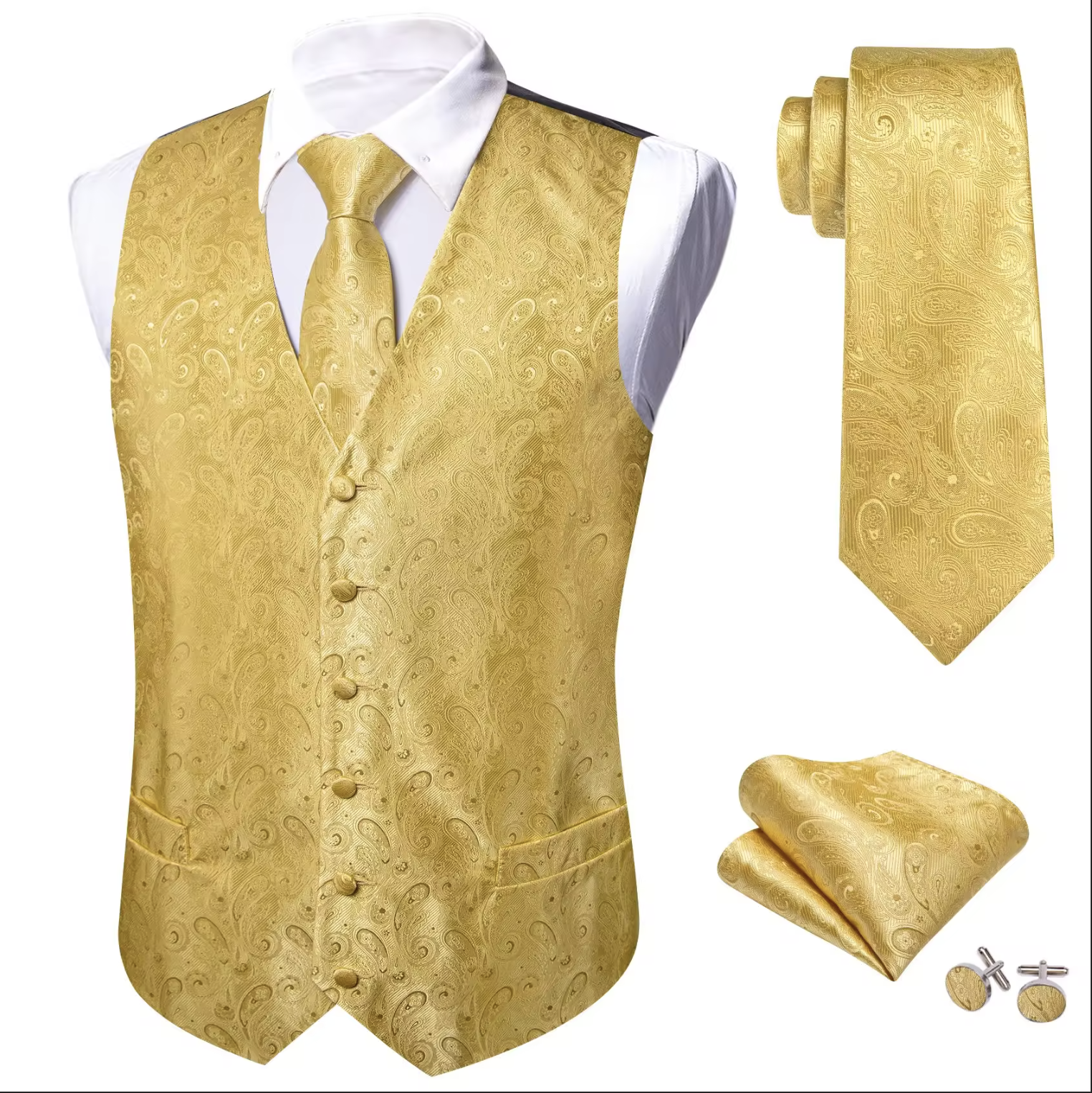 This set includes a waistcoat, necktie, pocket square, and cufflinks, providing everything you need to create a cohesive and polished look. The waistcoat is tailored for a comfortable fit, while the necktie and pocket square add a pop of color and texture. The matching cufflinks add a final touch of elegance.