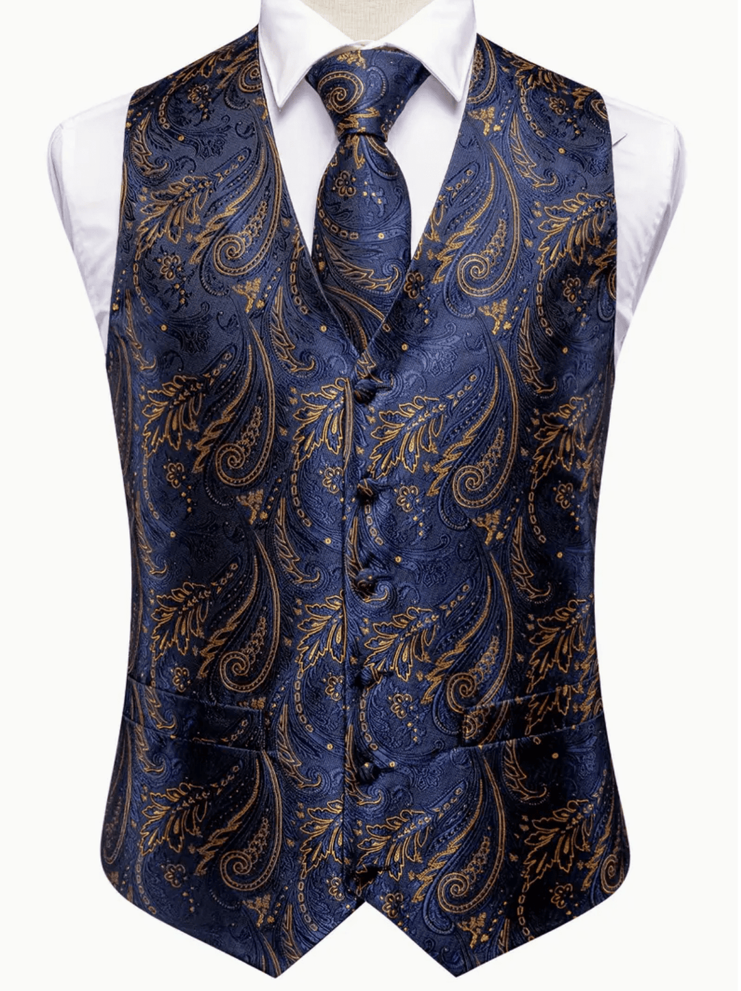 Men's Elegant Blue Paisley Waistcoat Set ,Polyester 100% - Includes Necktie, Handkerchief, and Cufflinks - MJ-3023 - SimonVon Shop
